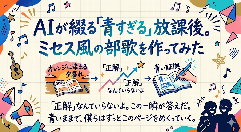 あなたのAIなら、どんな「青春」を歌い上げますか? ぜひ下の**『部室ノート(コメント欄)』**に、歌詞やフレーズを書き残していってください!